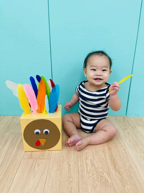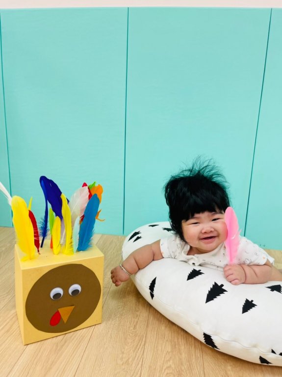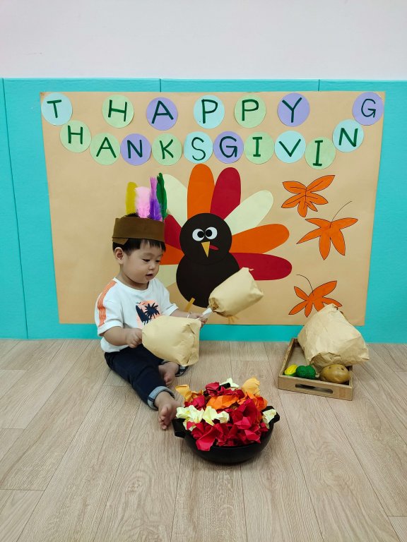 寶貝們參加了一場歡樂的感恩節派對唷!派對中,寶貝們帶著「印地安羽毛頭飾」,在溫暖的火堆旁,烤著香噴噴的火雞,玩得非常開心呢!