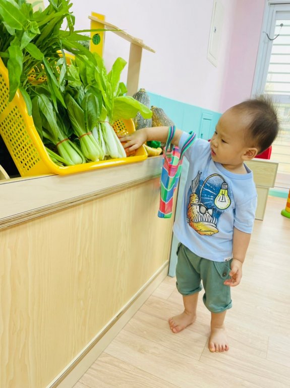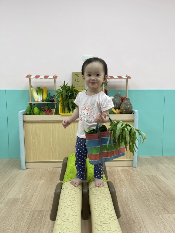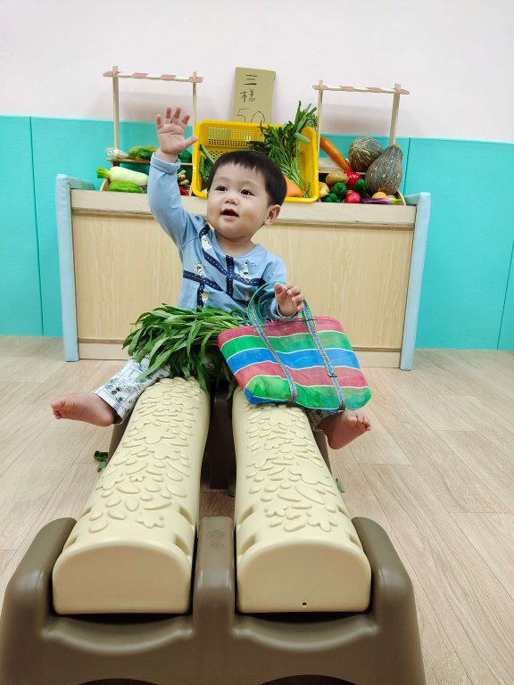 讓寶貝體驗提著購物袋買菜去!寶貝的架勢十足。
