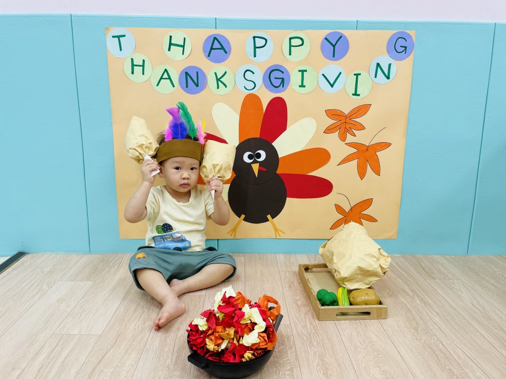 寶貝們參加了一場歡樂的感恩節派對唷!派對中,寶貝們帶著「印地安羽毛頭飾」,在溫暖的火堆旁,烤著香噴噴的火雞,玩得非常開心呢!