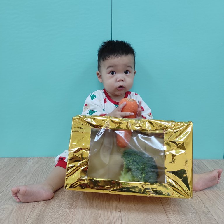 課程中藉由新鮮的花椰菜和紅蘿蔔,進行看`觸摸和抓握,透過觸覺探索,幫助寶貝動作及認知發展~