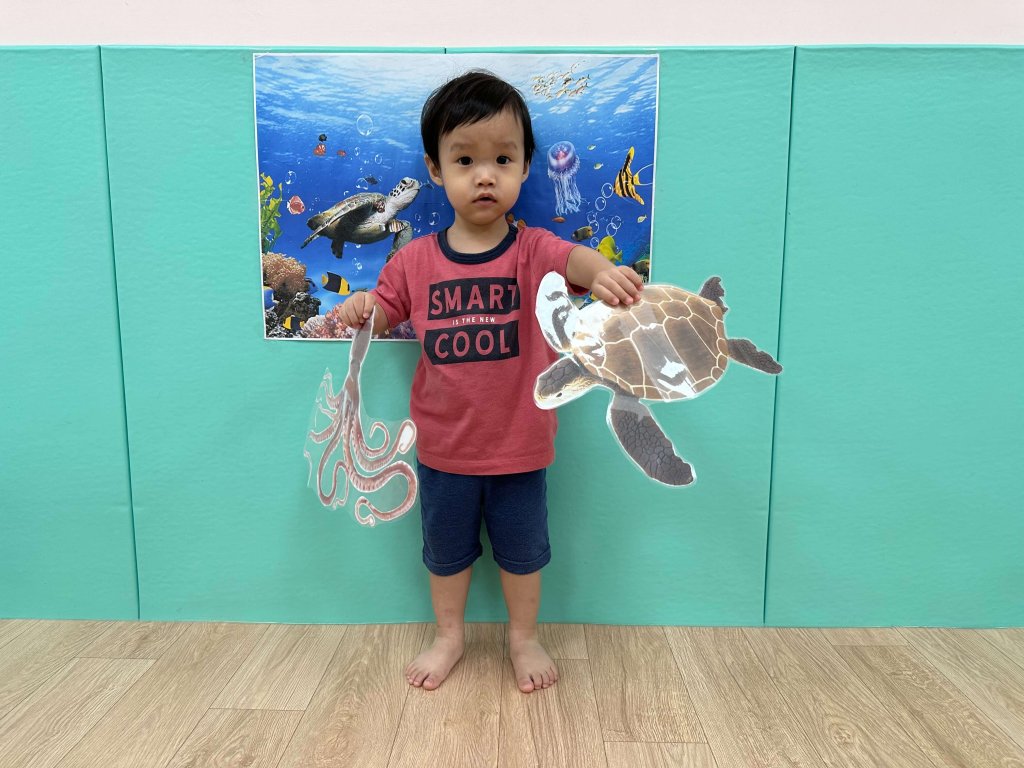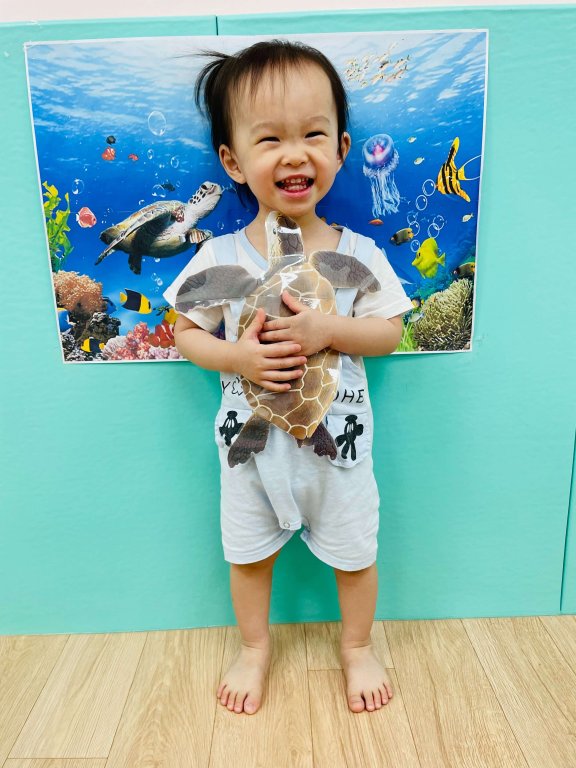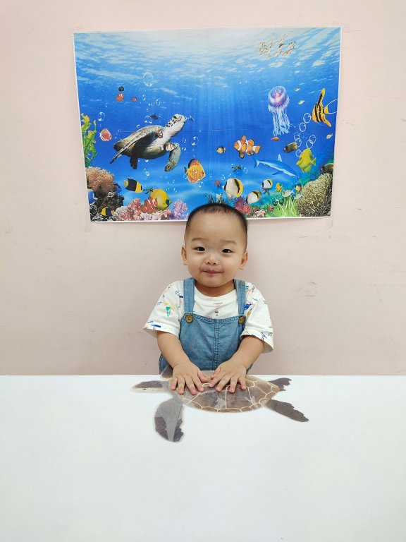 在海裡游來游去的是誰呀?原來是海龜~藉由海洋生物的剪影,訓練幼兒視覺對比,讓寶貝認知海龜的模樣。