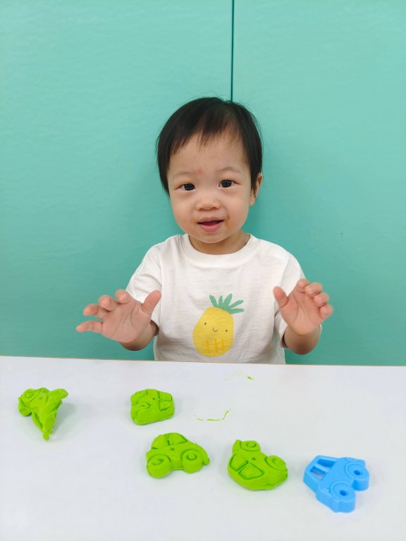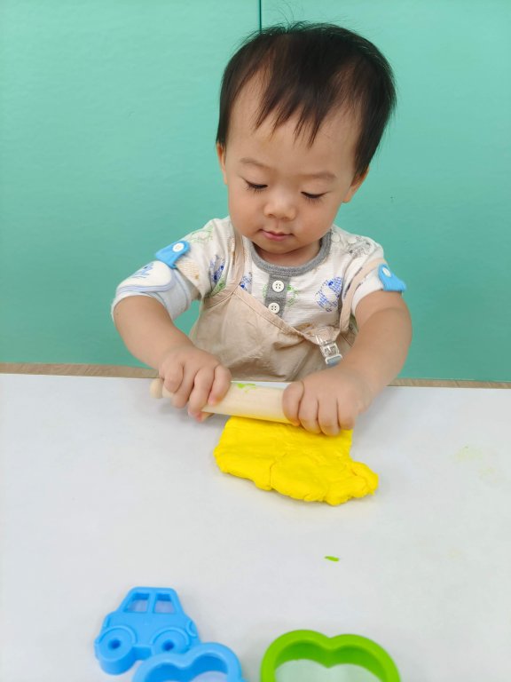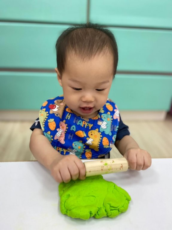 捏一捏揉一揉,寶貝很認真地玩黏土,操作黏土的過程中能滿足觸覺刺激並激發寶貝的美感及創造力。