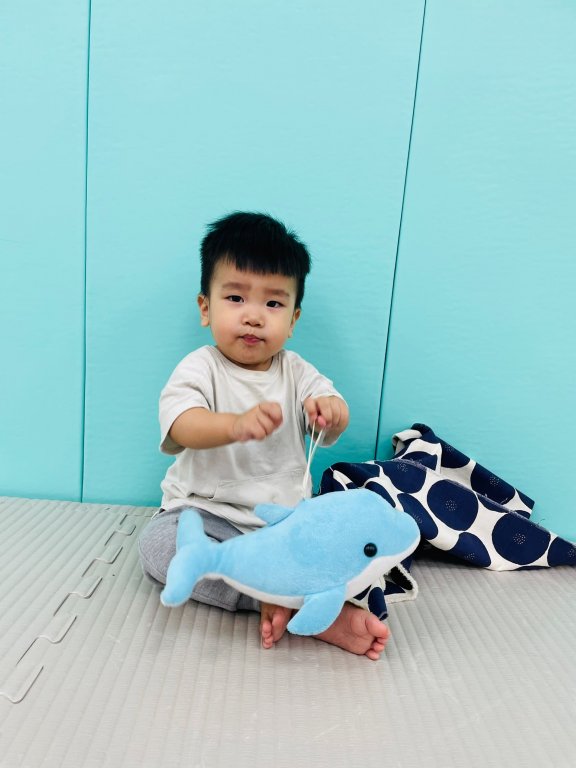耶 ~ 我找到海豚了 透過遊戲讓寶貝們知道 『即使沒看見,但仍然存在』的概念。小寶寶的第一次的布料觸覺體驗 , 開始慢慢拓展視野探索周遭的世界
