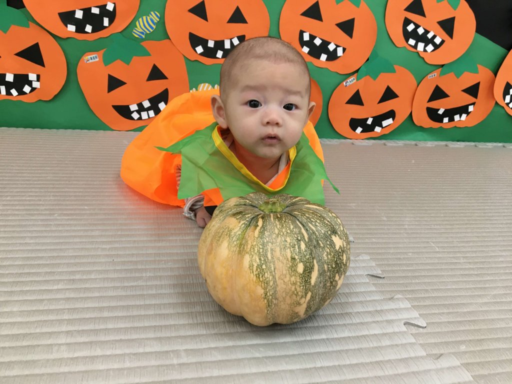 老師用有聲搖鈴引導寶貝快速向前爬,摸一摸大南瓜並與美麗場景合影,紀錄可愛的一天呦!
