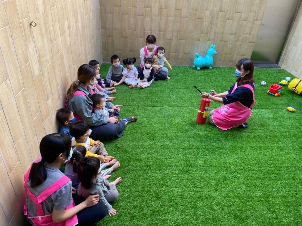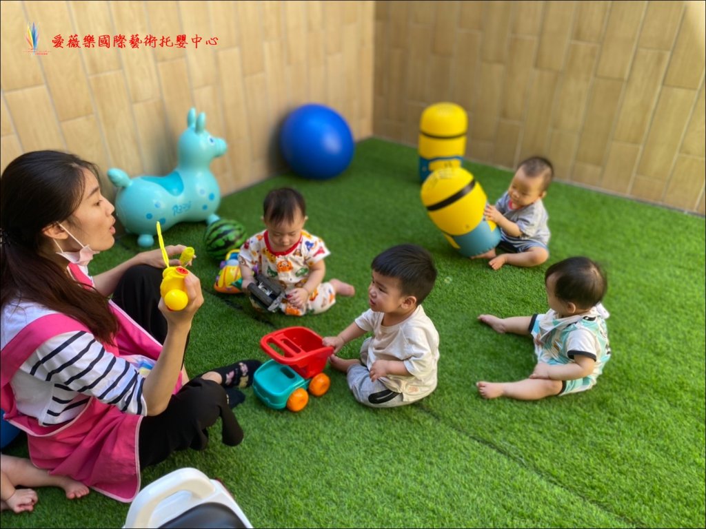 寶貝坐在草皮上,感受到草皮上的觸覺不同,看著老師吹泡泡,表情有驚又喜