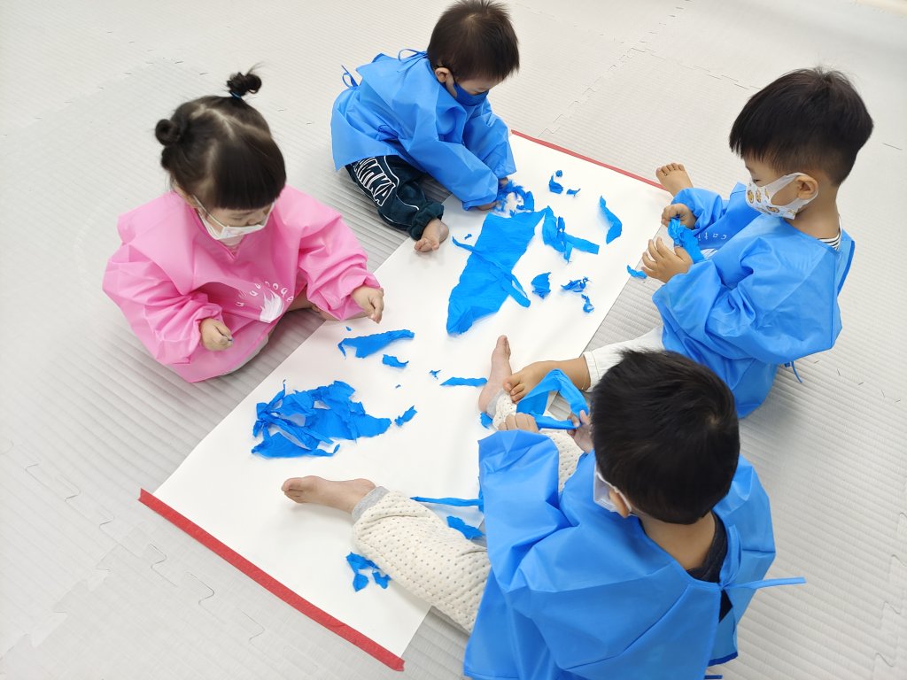 利用皺紋紙當媒材,寶貝不受限的發揮創意,完成美麗的海洋畫